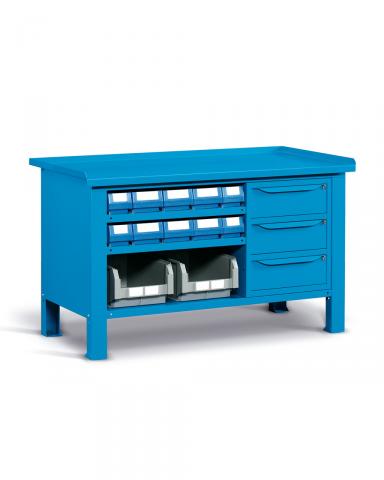 STEEL típusú acél munkaasztal acél munkafelülettel tárolókkal és MULTIBOX-szal 3 fiókkal - DIM. MM W=1507 D=705 H=855 - Szín: kék RAL5012