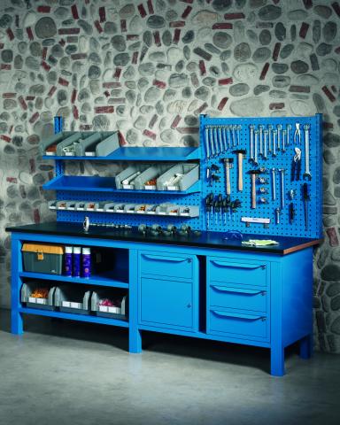 STEEL típusú acél munkaasztal Multiplex munkalappal WITH CONTAINERS - DIM. MM W=2500 D=750 H=880 - Szín: kék RAL5012